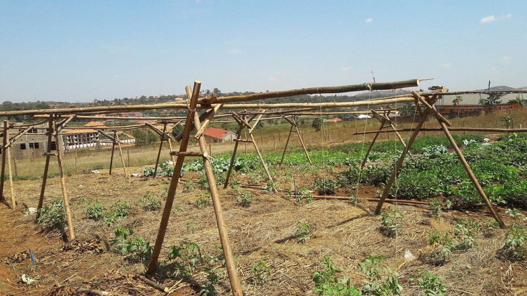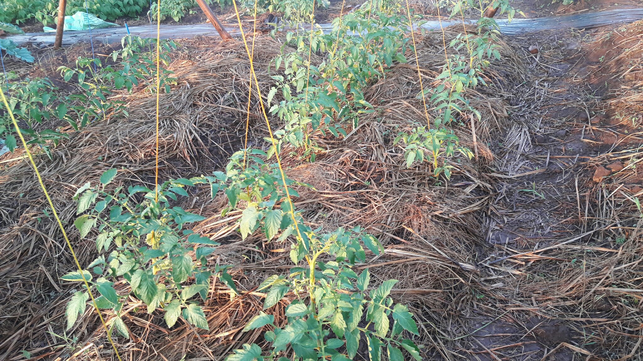 The tomatoes have blossomed quite fast despite the heat. So we have had to install some kind of support structure for them.