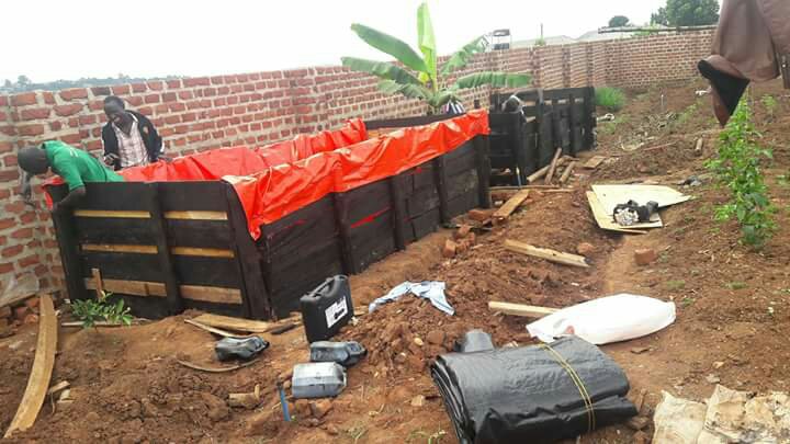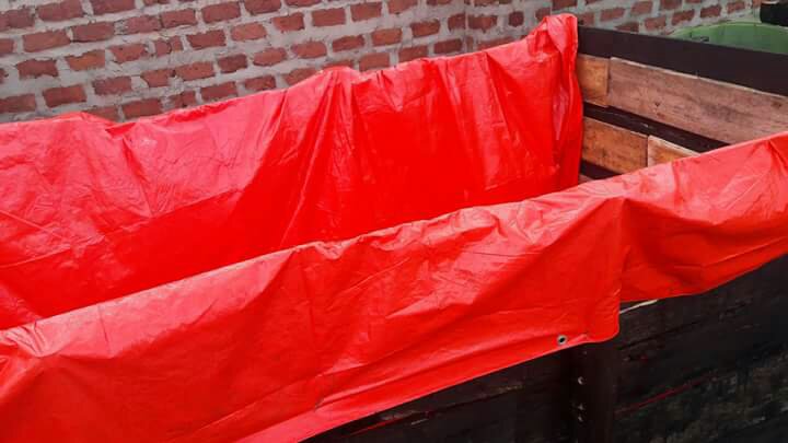 Installing the first layer of tarpaulin in the backyard fish pond. This layer simply acts as a cushion for the delicate and expensive pond liner.