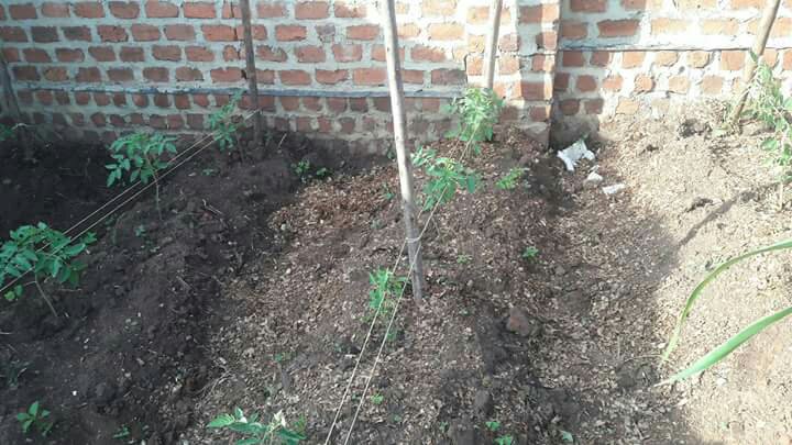 Experimenting with a different type of tomato trellis using horizontal strings tied to vertical poles to support the tomatoes. I saw this on YouTube and thought I could replicate it!