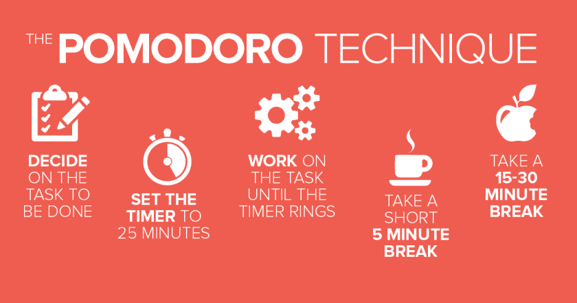 The pomodoro technique is a time management technique which can be used to get more things done. The technique typically uses a timer to chunk work into intense intervals of 20 to 25 minutes separated by a short 5 minute break. A longer break of 15 to 20 minutes is allowed after 3 or 4 intense sessions.