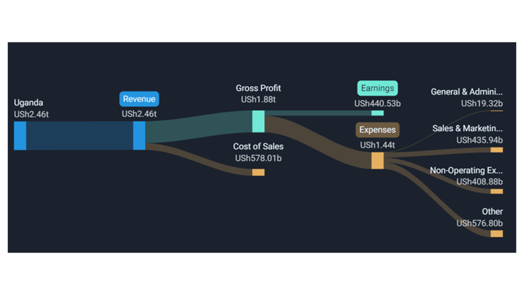 MTN Uganda is highly profitable with net profits of ugx 440.53bn. Gross revenues, including mobile money revenues, were ugx 2.6 trillion. This represents a net margin of 17.9%, with past earnings growing at 17% per year. Revenues have been growing at an average rate of 13.8% per year. MTN Uganda’s return on equity is 43.7%, and the return on capital employed is about 40%. These metrics point to how effectively the company is using its capital to generate profits for investors.