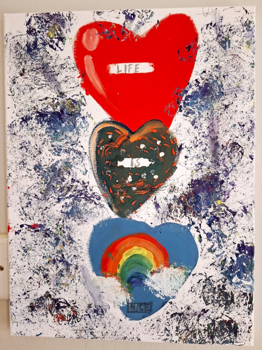 Finally, the bottom heart, painted in blue and featuring a rainbow emerging from it, represents “NICE.” This might symbolize hope, peace, and the beauty that comes after enduring life’s challenges. The rainbow is a universal symbol of hope and promise, often appearing after a storm. This heart seems to convey the message that despite the difficulties one might face, there is always the potential for joy, healing, and brighter days ahead.