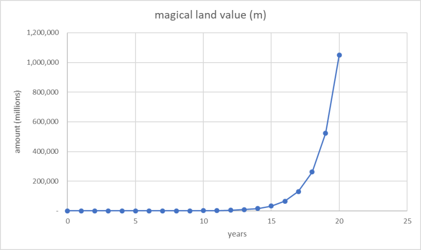 Imagine that you can buy a magical piece of land in a prime location for only UGX 1 million today. This magical piece of land doubles in value every single year for the next 20 years. Sounds too good to be true, right? Well, even though such magical investments rarely exist in real life, this example can teach us something extraordinary about compounding.